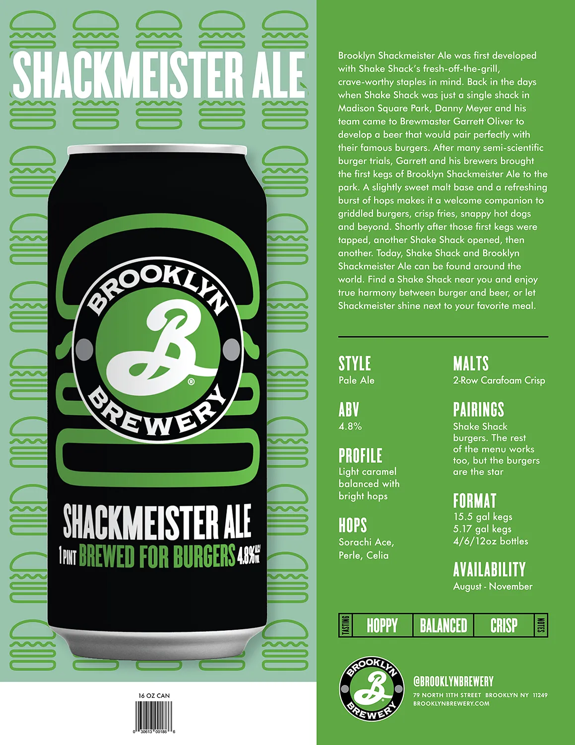 A great many “field trial burgers” later, we delivered the first kegs of Brooklyn Shackmeister Ale to Madison Square Park. Today, Shacks around the world proudly stock the nobly-purposed ale. We brew Shackmeister Ale as a hearty pale ale with plenty of malts to match the rich, griddled beef in every Shackburger. A bright burst of hops unifies the finish and invites the drinker to take another bite and accompanying sip.